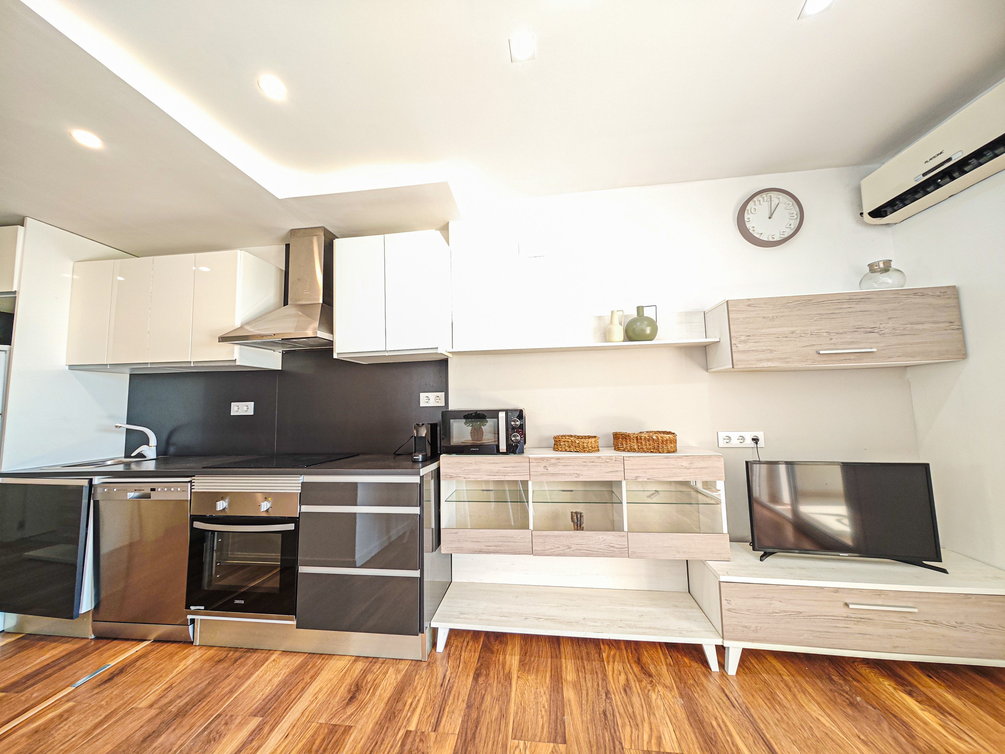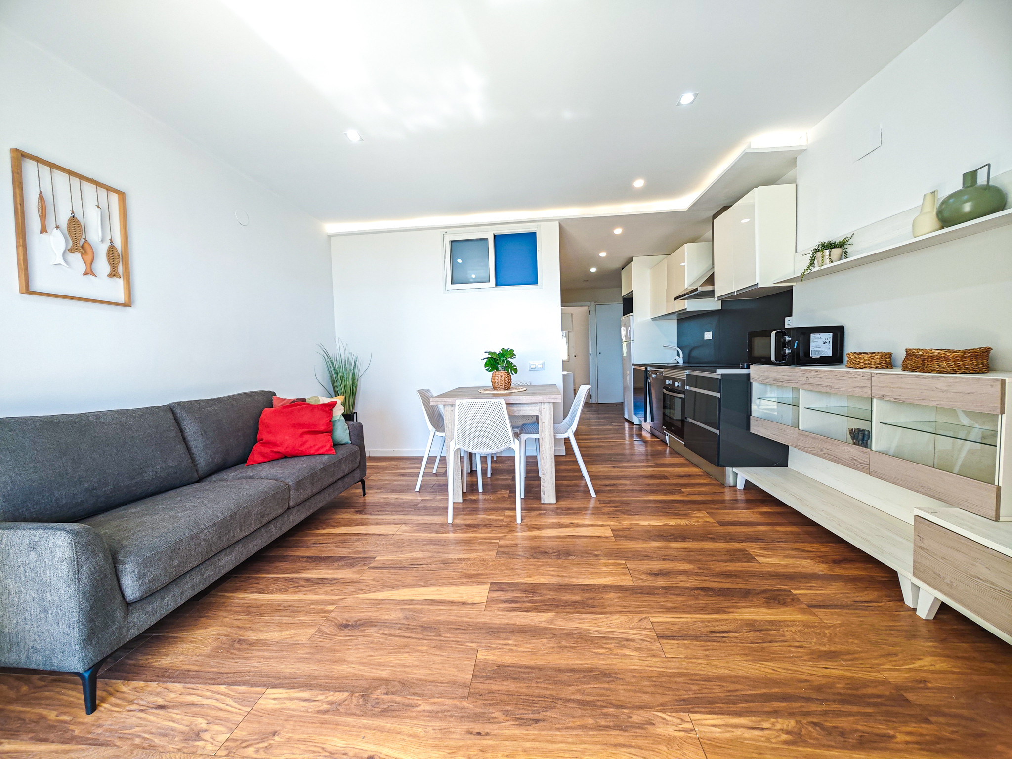 El apartamento cuenta con una habitación con una cama doble y dos camas individuales, permitiendo alojar cómodamente hasta 4 personas. Dispone de un baño completo con bañera, perfecto para relajarse después de un día de playa. La cocina americana está totalmente equipada con electrodomésticos modernos como nevera, congelador, lavadora, horno, microondas, cafetera y una amplia variedad de menaje.