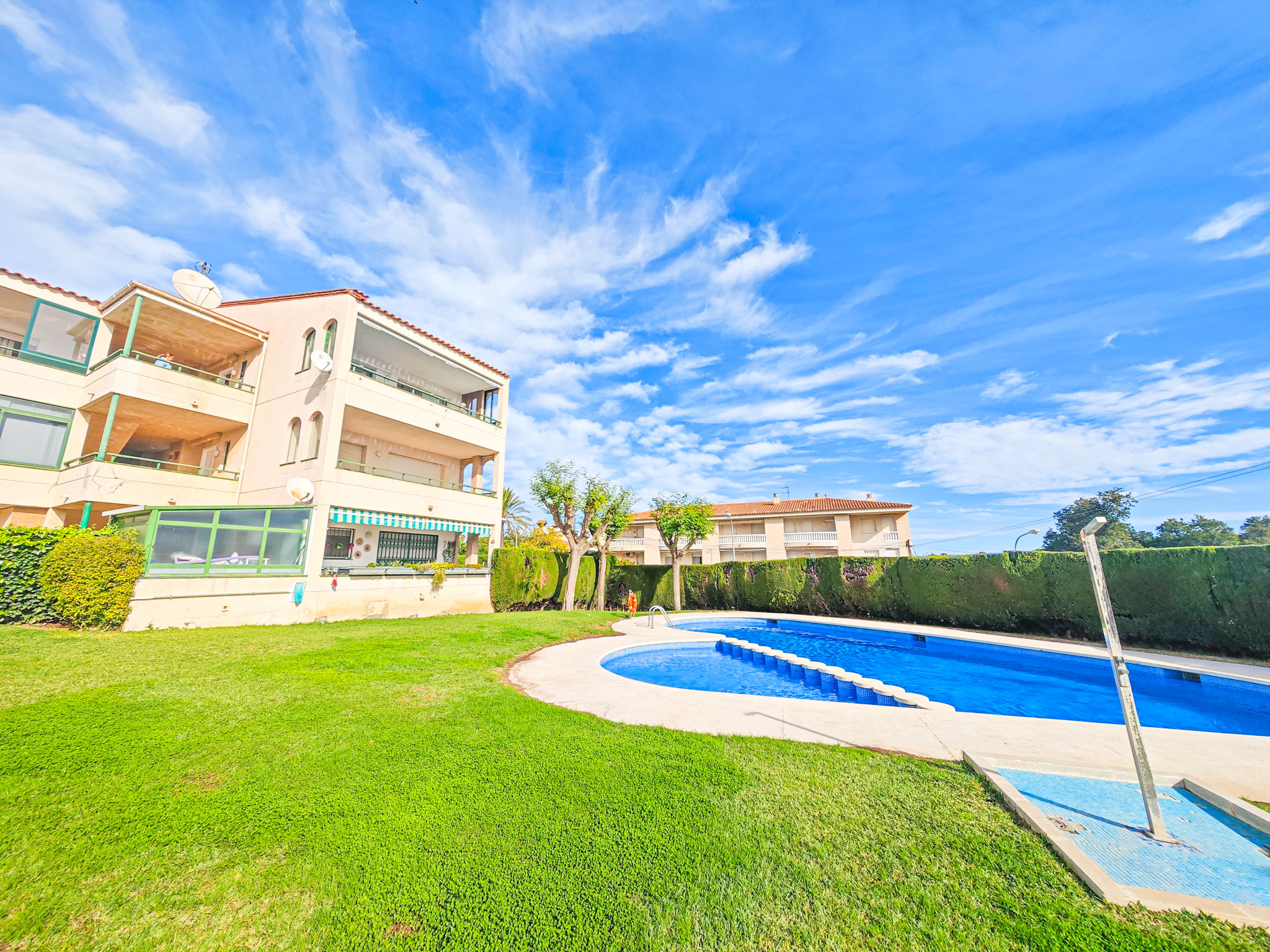 Una zona comunitaria amplia y agradable con una gran piscina para disfrutar con los más pequeños de la casa de las vacaciones de verano. Golf de Sant Jordi está situado a tan solo 50 m de la playa de la Llosa donde podréis disfrutar de restaurantes, chiringuitos en la arena, alquiler de tumbonas y parasoles. Se trata de una zona tranquila y familiar muy cerca del centro pero lo suficientemente lejos para no sufrir aglomeraciones.