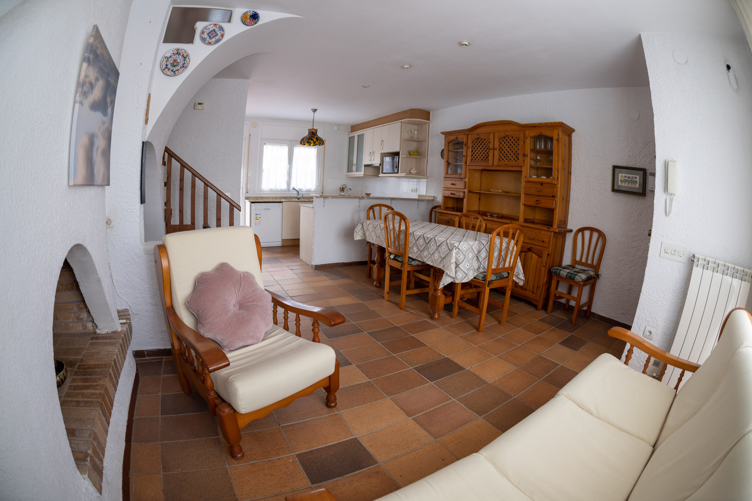 La cocina americana está completamente equipada con electrodomésticos modernos, incluyendo nevera, congelador, lavadora, lavavajillas, microondas, horno, cafetera y menaje completo. Es ideal para preparar comidas familiares y disfrutar de momentos gastronómicos juntos.