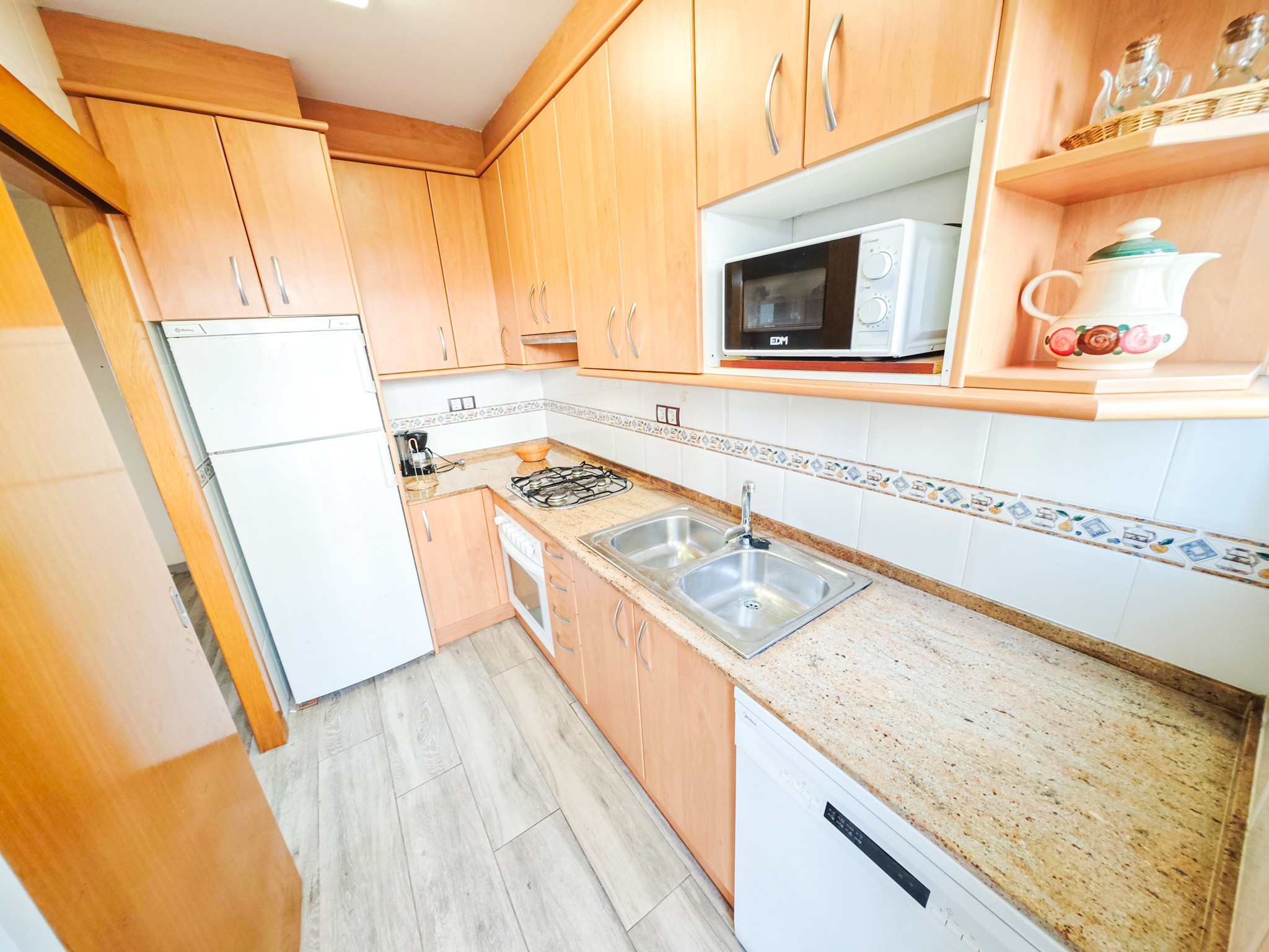 Die Separate Küche mit Ceranfeld ist ausgestattet in einen Kühlschrank, eine Mikrowelle, ein Backofen, Gefrierschrank, eine Spülmaschine, Geschirr/Besteck, Kochutensilien, eine Kaffeemaschine und einen Toaster.