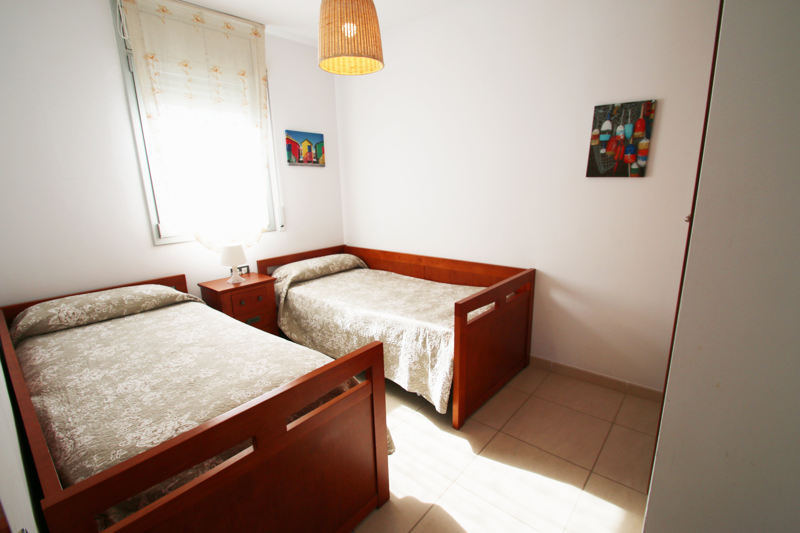 Die Wohnung verfügt über zwei Schlafzimmer, die bequem bis zu 5 Personen beherbergen können, mit einer Aufteilung, die ein Doppelbett, zwei Einzelbetten und ein Sofa umfasst. Der lichtdurchflutete Wohnbereich mit Klimaanlage ermöglicht es Ihnen, sich nach einem Tag am Strand zu erholen, während Sie Fernsehen oder das WLAN-Netzwerk genießen.