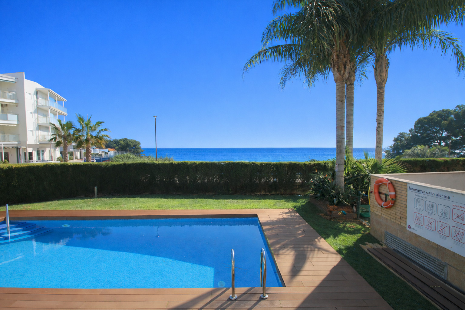 Die Terrasse-Garten ist der große Anziehungspunkt der Unterkunft. Von diesem Außenbereich aus genießt man einen angenehmen Meerblick, der ein Gefühl von Weite und Nähe zum Mittelmeer vermittelt und gleichzeitig Privatsphäre bewahrt. Es ist perfekt, um draußen zu frühstücken, sich in der Sonne zu entspannen oder in ruhiger Atmosphäre zu dinieren, während man die Meeresbrise spürt. Der gepflegte und zugängliche Gemeinschaftspool ermöglicht es, Strand und Erholung abzuwechseln, was besonders bequem ist, wenn man mit Kindern reist.