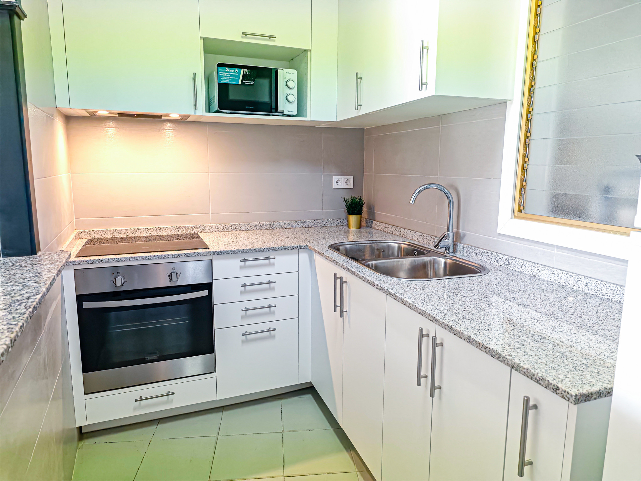 The apartment includes 2 double bedrooms, 1 bathroom, and a well-equipped kitchen, providing all the comfort you need for a pleasant stay. One of the main highlights of this apartment is its spacious terrace with spectacular views of the sea and the pool, perfect for al fresco dining or relaxing in the sea breeze.
