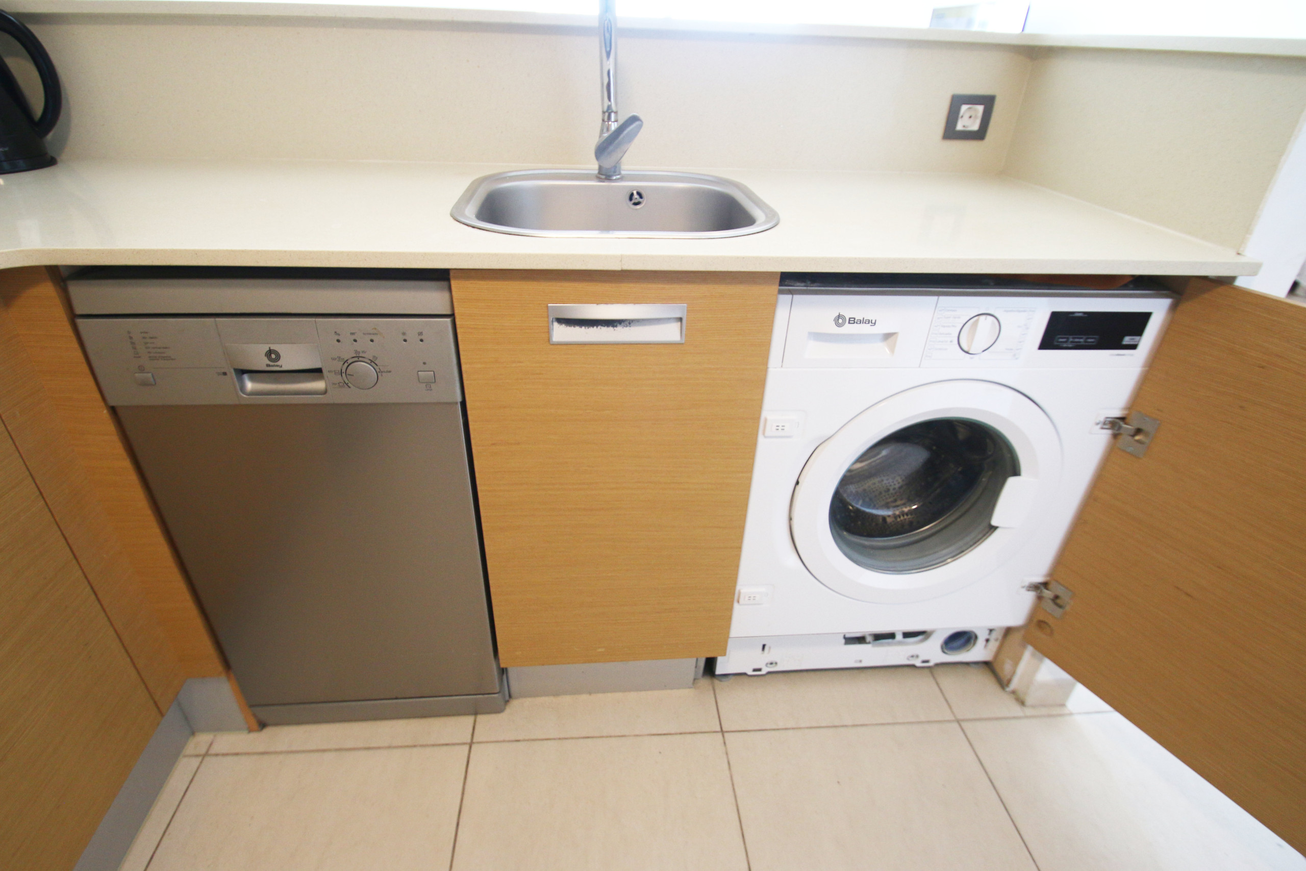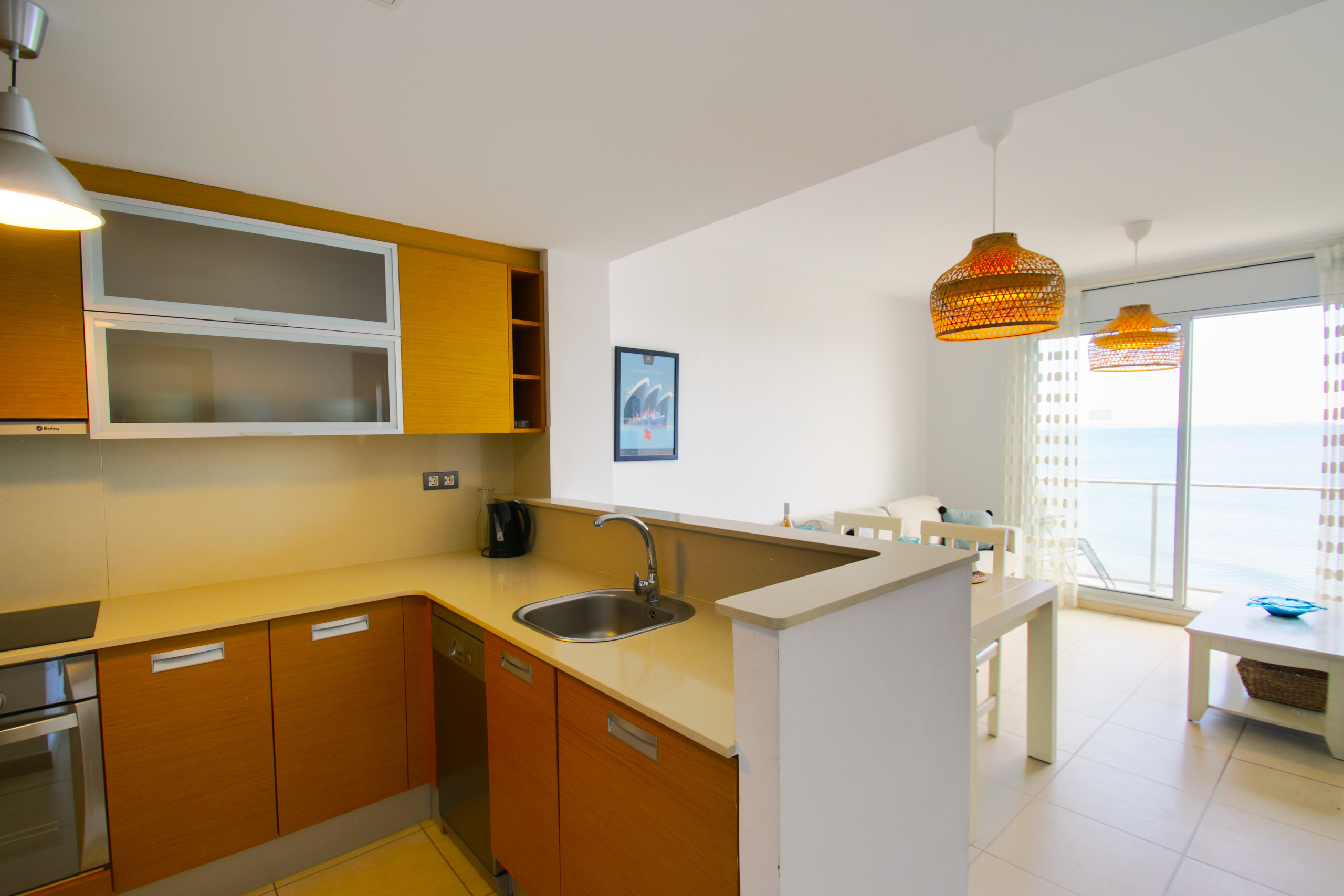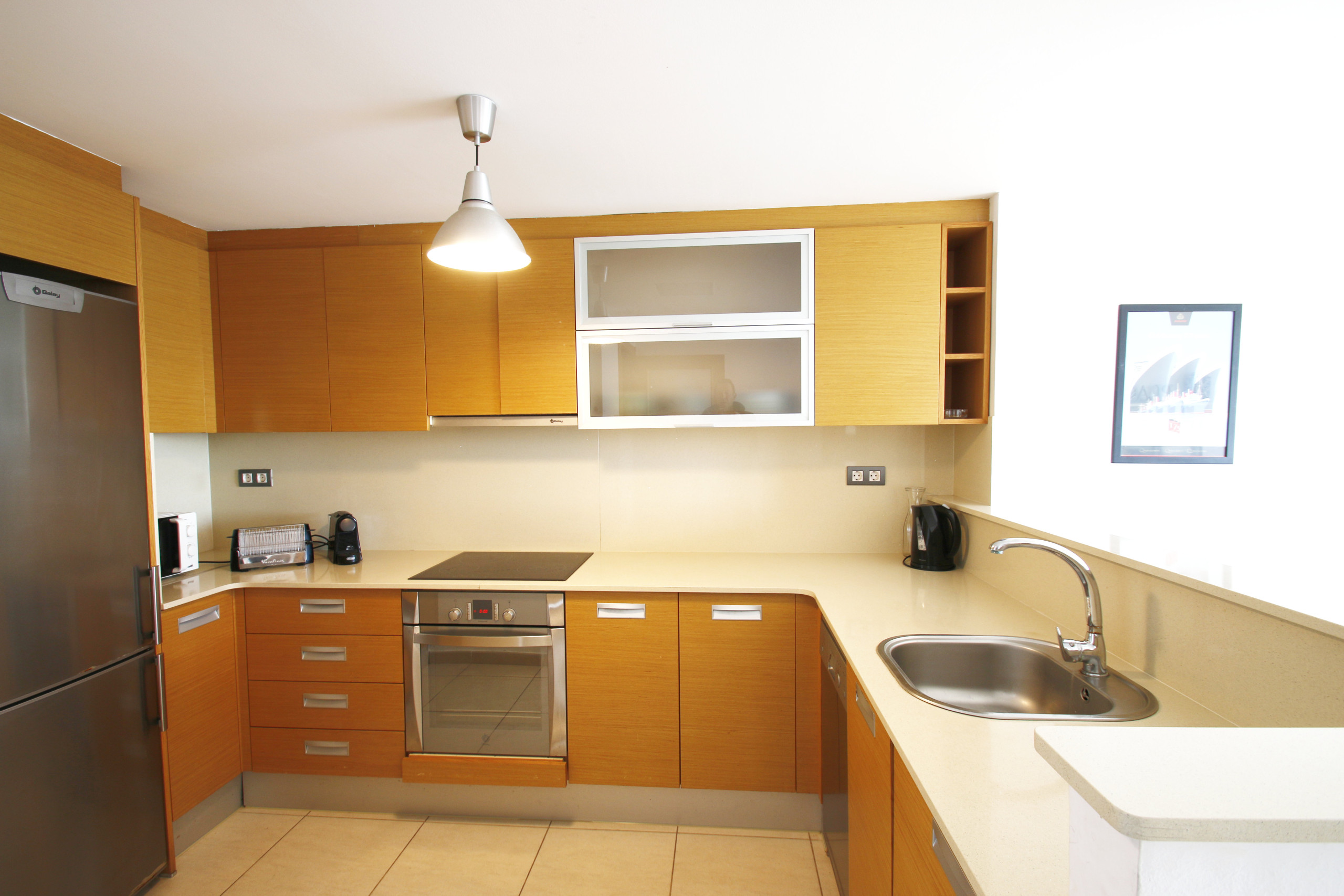 La cuisine américaine est entièrement équipée d'électroménagers de dernière génération, comprenant un réfrigérateur, un congélateur, un lave-vaisselle, un micro-ondes, une machine à café et tous les ustensiles nécessaires pour préparer de délicieux repas. De plus, elle dispose d'une zone de repassage pratique pour votre confort.