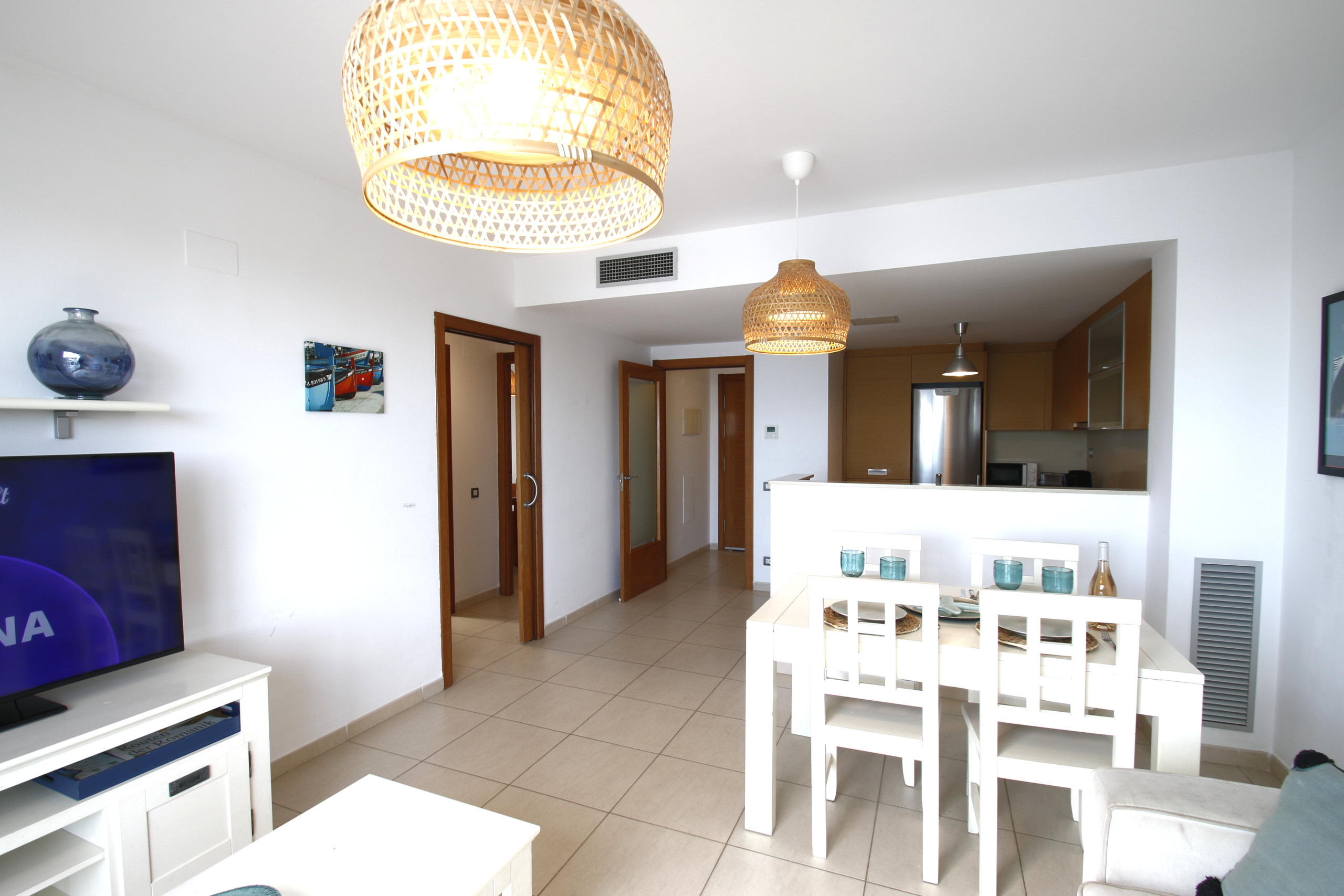 L'appartement dispose de deux chambres pouvant accueillir jusqu'à 5 personnes confortablement, avec une disposition comprenant un lit double, deux lits individuels et un canapé. Le salon lumineux avec climatisation vous permettra de vous reposer après une journée à la plage, tout en profitant de la télévision ou de la connexion WiFi.
