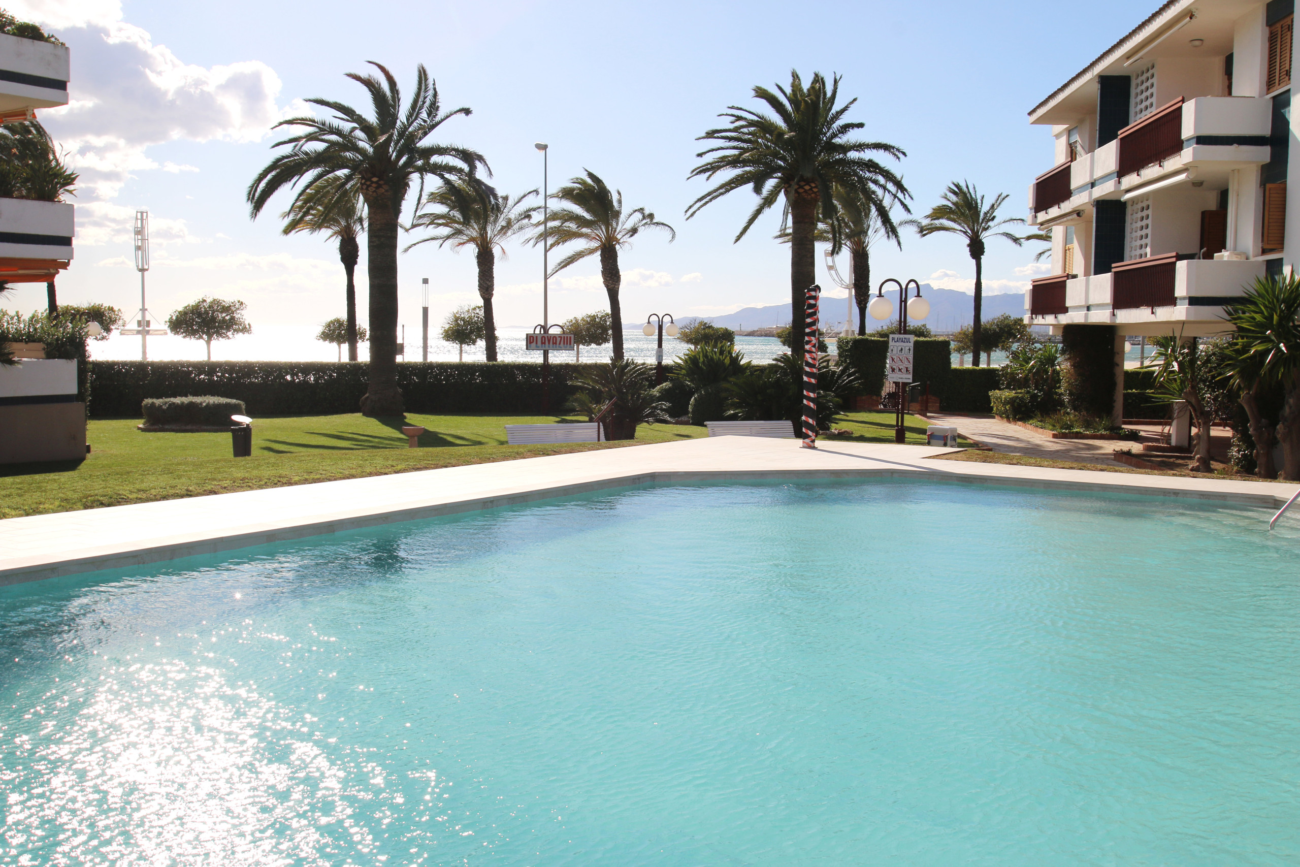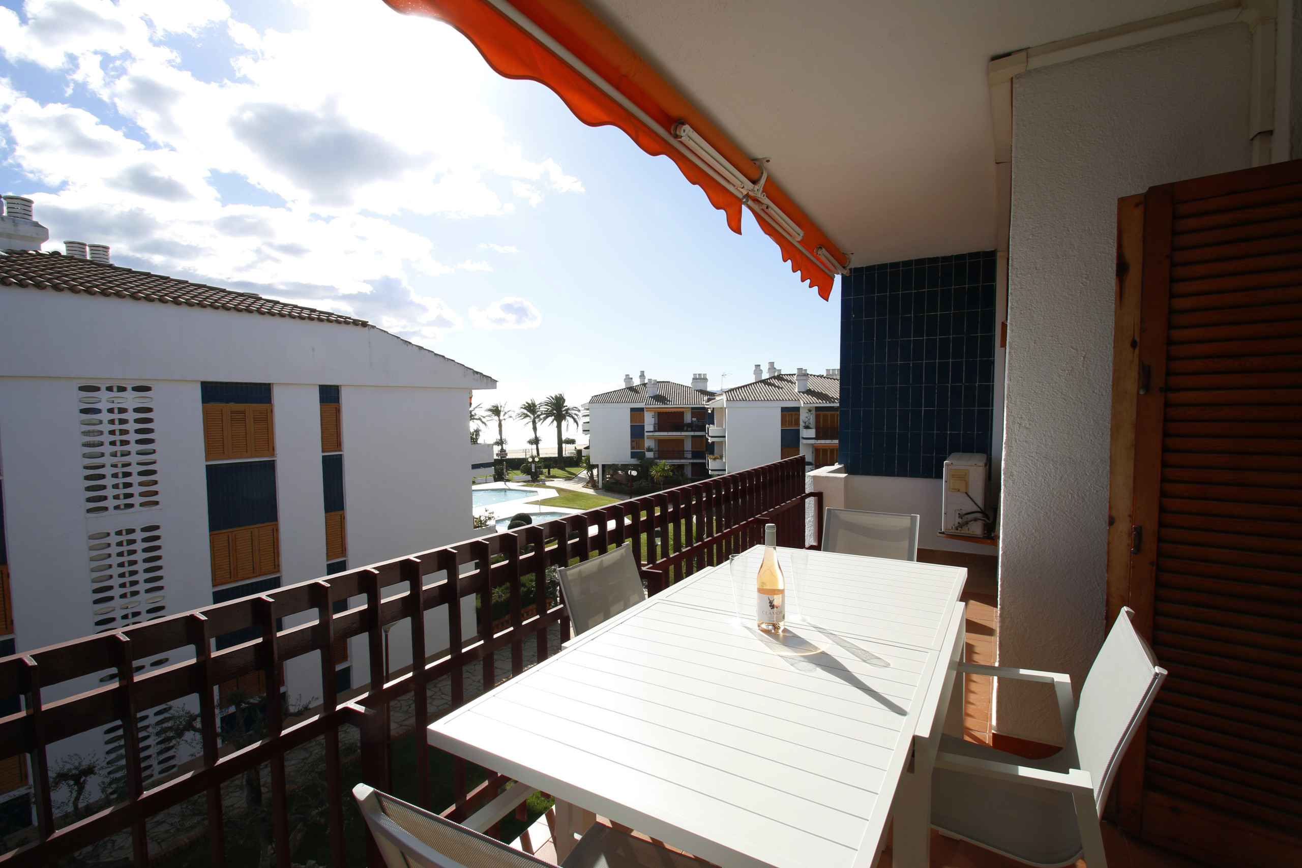 Размещение имеет Терраса, стиральная машина, утюг, систему кондиционирования только в гостиной, бассейн жилого комплекса, телевизор.
